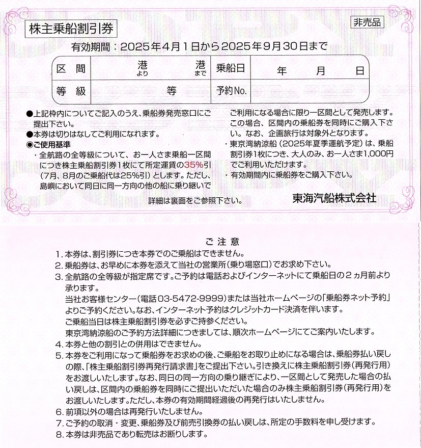 - 東海汽船 株主優待券 35%割引券 1枚(単位) 〜9枚迄 2025年9月末迄有効 伊豆大島航路 ※7・8月は25%割引