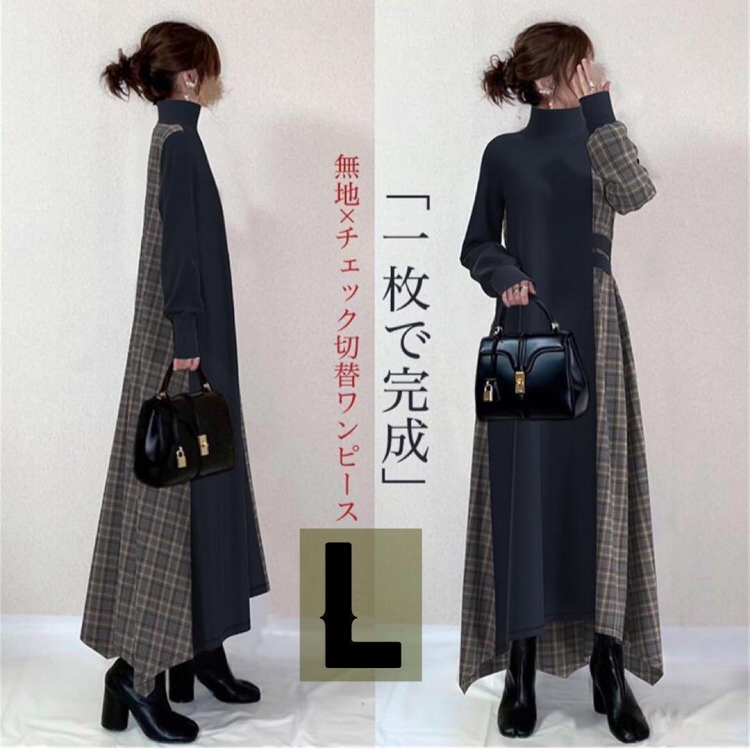 - ハイネック バイカラー 長袖 ロング ワンピース チェック ワンピ 柄