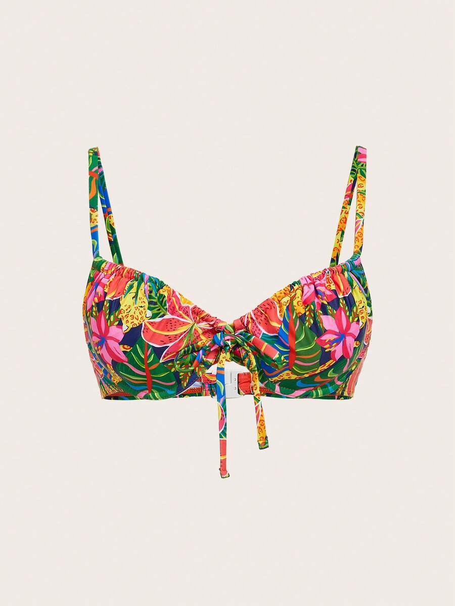 - レディース 水着 トップス 熱帯植物プリント フロントタイ ビキニトップ レディース 夏用ビーチ