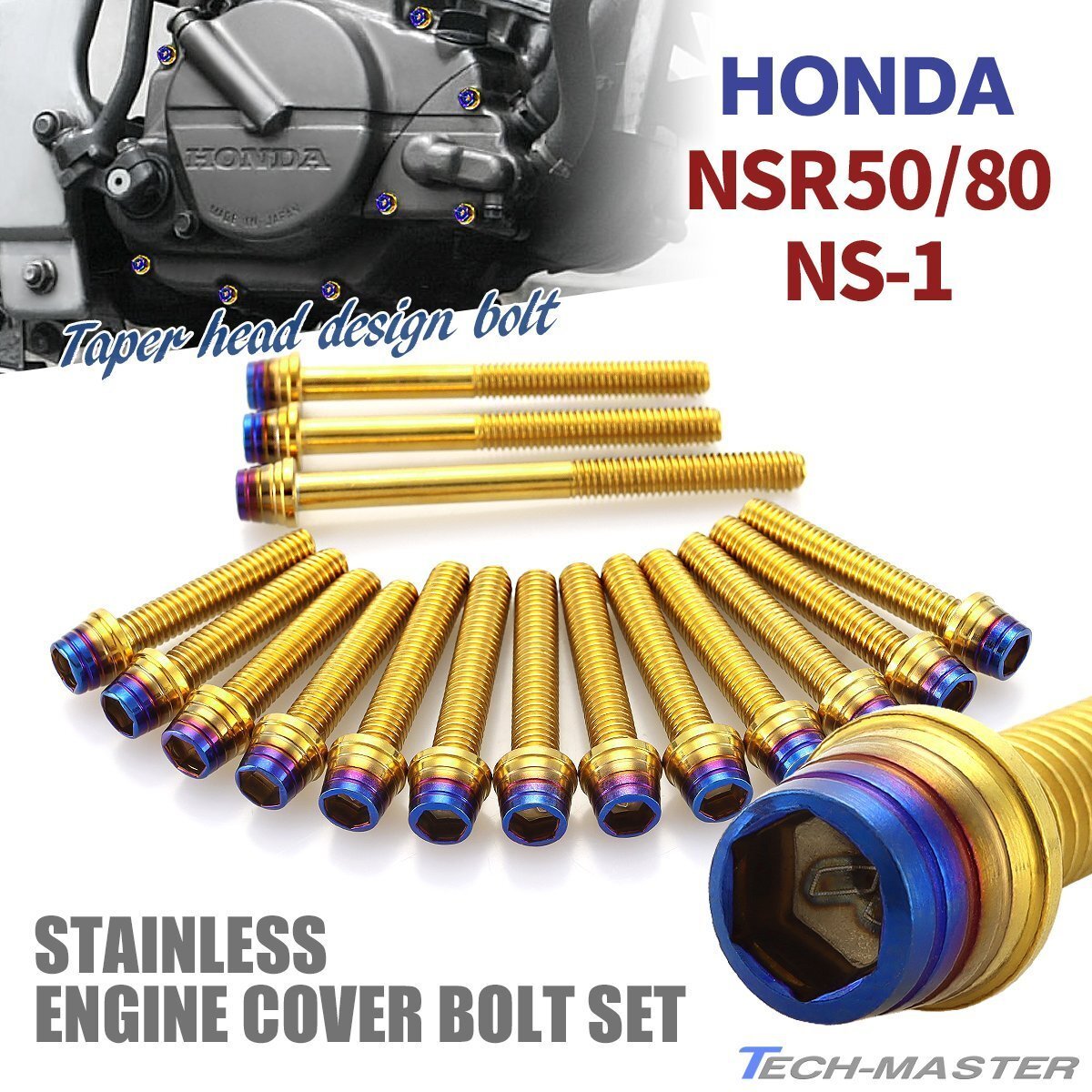 - NSR50/80 NS-1 エンジンカバー クランクケース ボルト 16本セット ステンレス製 テーパーシェルヘッド ゴールド×焼きチタンカラー TB6049