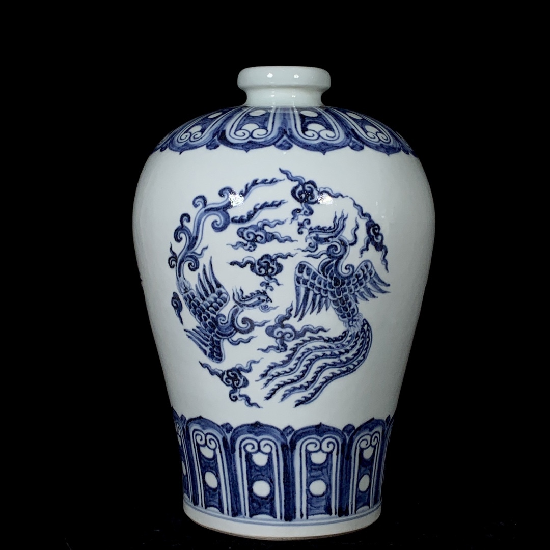 - TM9#8729【3.1】中国骨董 人間国宝 磁器【明宣徳青花鳳紋梅瓶です】工芸品 施釉陶 青花磁 陶芸 精美彫 置物 收藏品