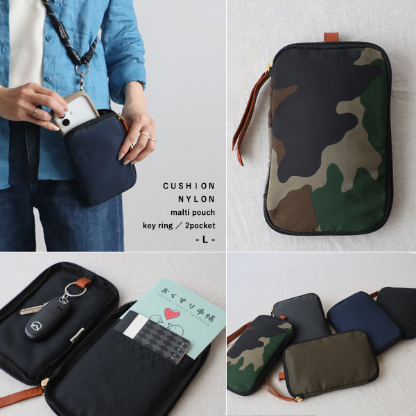 - 新作 Lサイズ クッションナイロン キーケース お薬手帳 スマホ ポケット 牛革レザー ポーチ 軽量 カモフラ柄 S10E