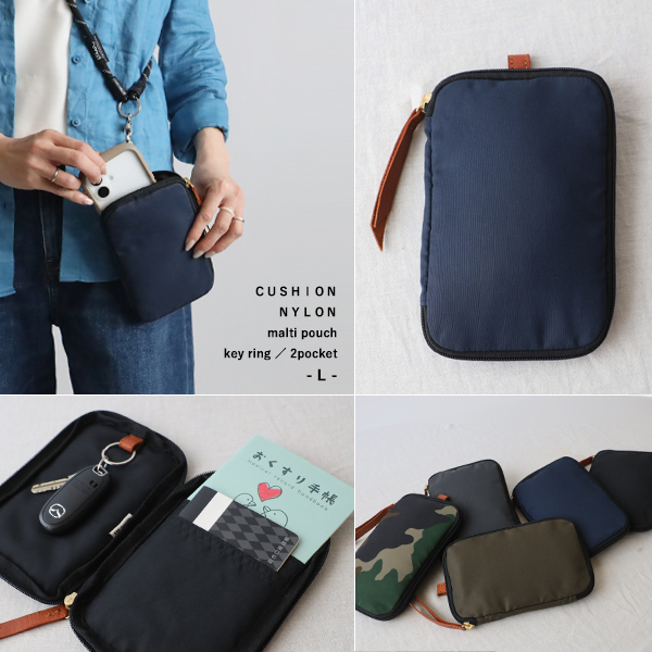 - 新作 Lサイズ クッションナイロン キーケース お薬手帳 スマホ ポケット 牛革レザー ポーチ 軽量 S10A