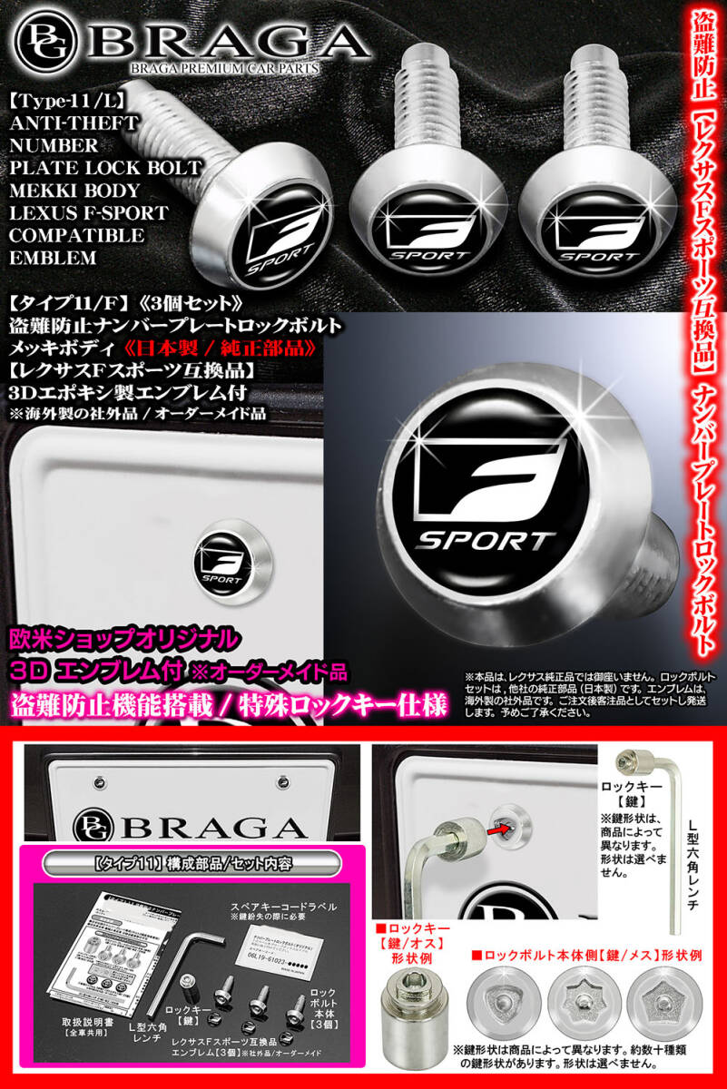 - ES/HS/CTF/レクサスFスポーツ/盗難防止ナンバープレート ロックボルト/Fスポーツエンブレム付/互換品/タイプ11F/3個セット/ブラガ