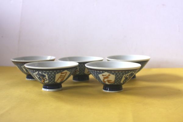 - 未使用品 レトロ ごはん茶碗 5客まとめて 御飯茶碗 器 和食器 月・花 金文字/27N8.7-176