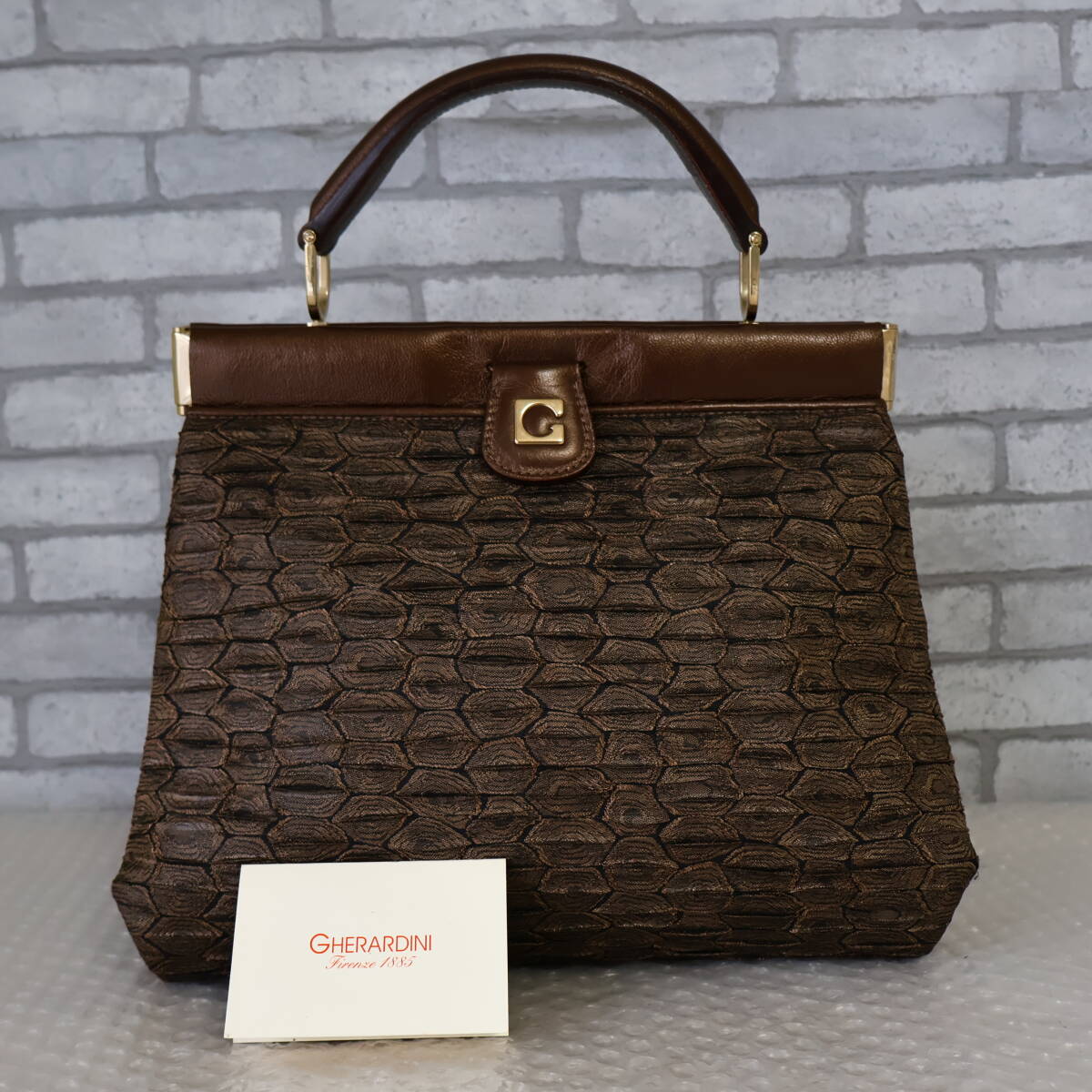 > *美品*ヴィンテージ*レア*イタリア製*GHERARDINI/ゲラルディーニ*DODICIDODICI*亀甲柄織物×レザーコンビ*2室*ハンドバッグ*ブラウン*