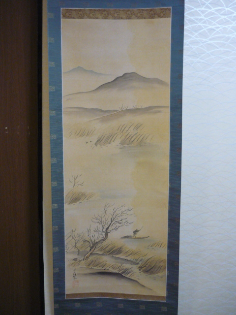 > 【模写】 掛軸 小川芋銭 天王崎より筑波遠望 絹本 大きさ全体約190cmx51.5cm 絹本部分約110cmx41cm 合わせ箱あり