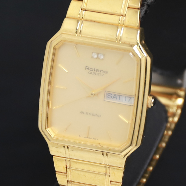 - 稼働 QZ 良品 石付 Rolens BLESSING 5817 ゴールド文字盤 デイデイト メンズ腕時計 2000000 NSK KRK