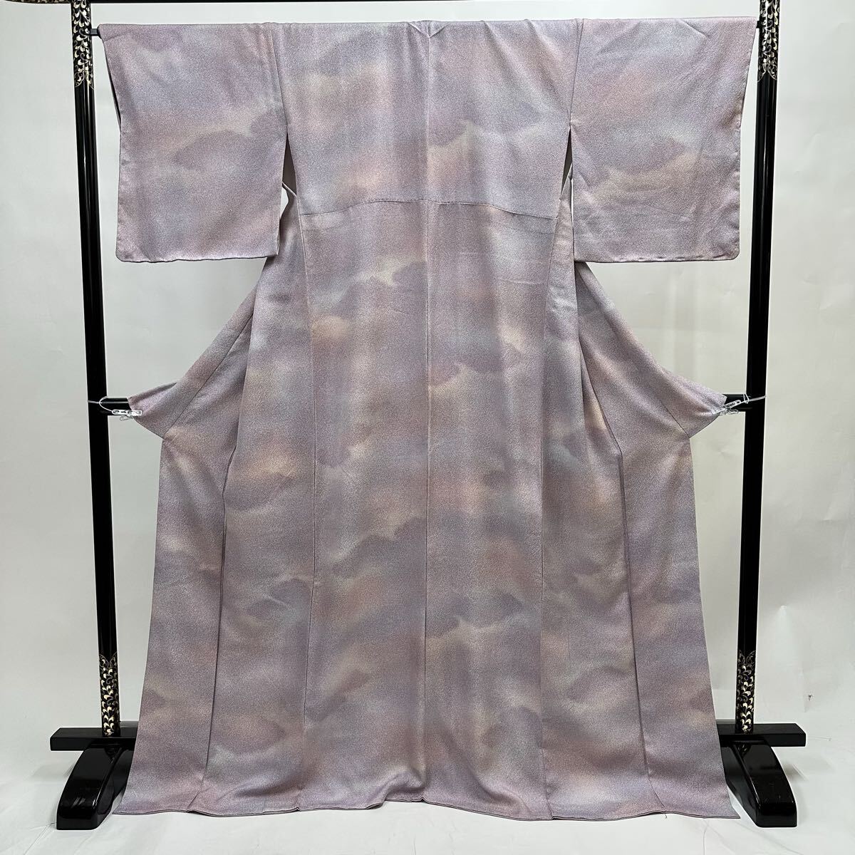 - 【七福】c845 正絹 色無地 暈し染 家紋有 三つ巴 上品な紫 ラベンダー 堅牢染 暗文 紋意匠 袷 着物 仕立上り 逸品 身丈 約170cm 裄 約66cm