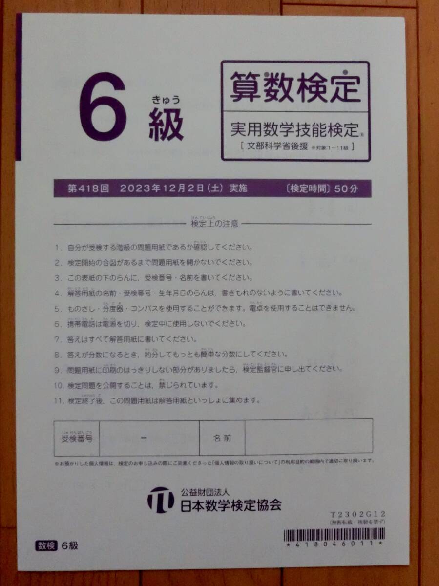 - 送料140円 算数検定 6級 第418回 2023年 過去問 本物 実物 実用数学技能検定 解答用紙付き 中学受験 小学6年生 / 数学検定