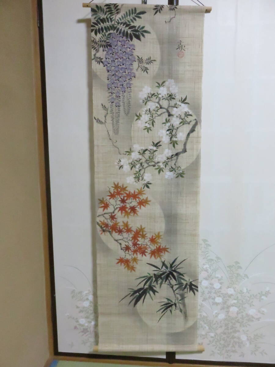 - ●麻(天然) タペストリ 円(月?)に藤桜紅葉竹の図 千秋 落款あり●タペストリー