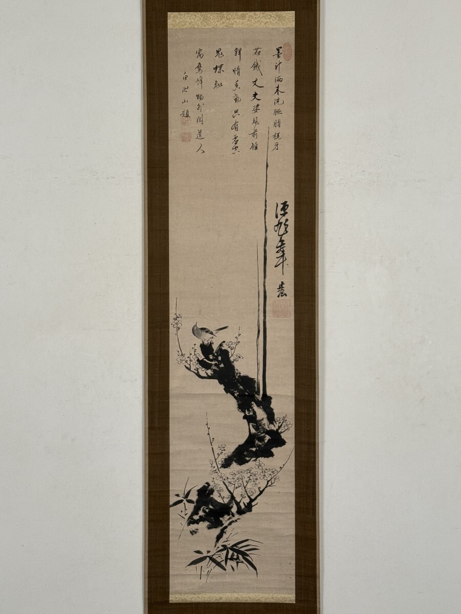 - 【真作】掛軸「松平楽翁画 卍山道白賛 梅鴬画賛」江戸時代 陸奥白河藩第3代藩主 松平定信 曹洞宗僧侶 加賀大乗寺住職 書画