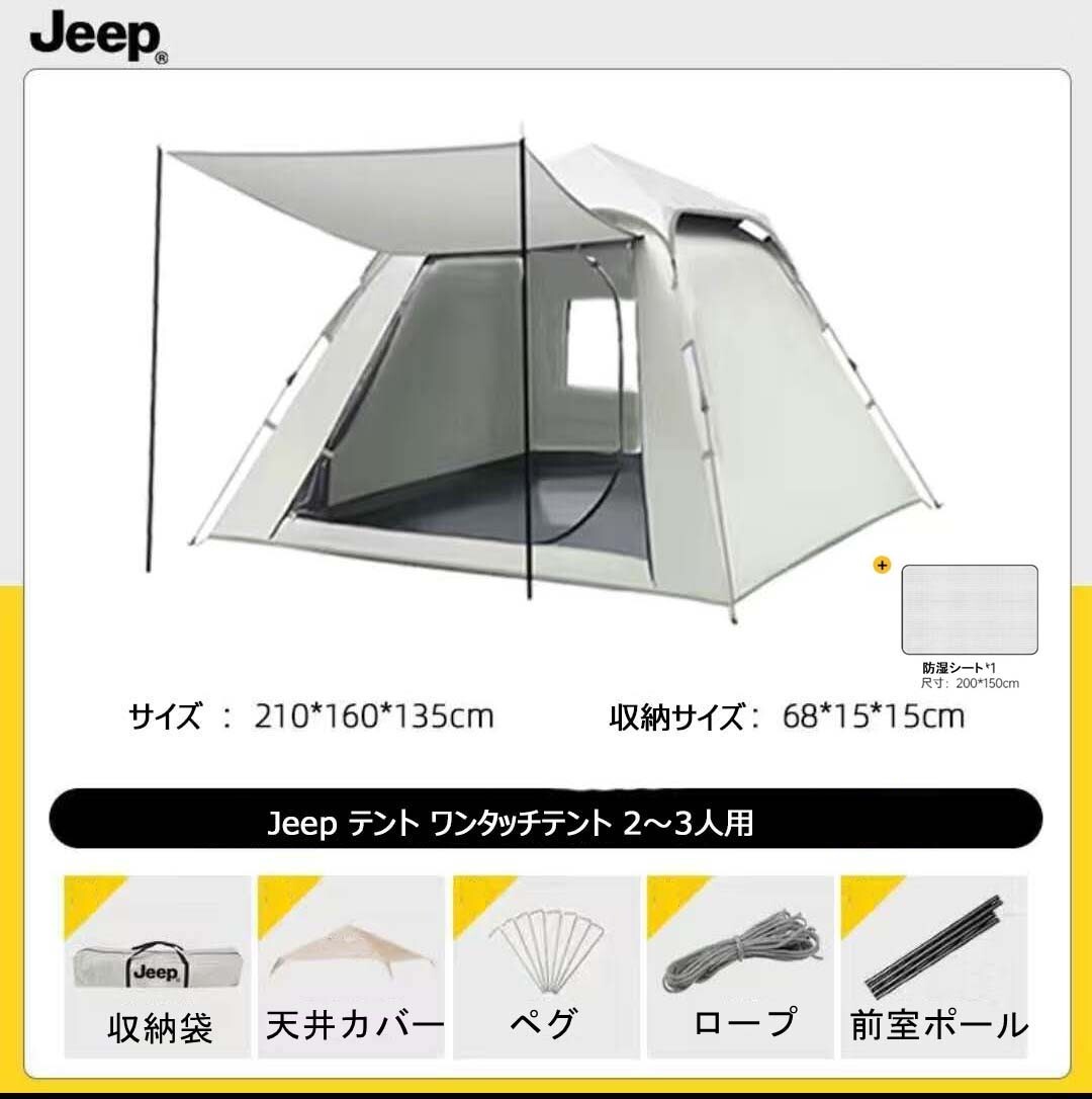 > Jeep テント ワンタッチテント 2~3人用 設営簡単 uvカット加工(サイズ:210*160*高135cm 天井カバー付き 防湿シート付き)JP119F