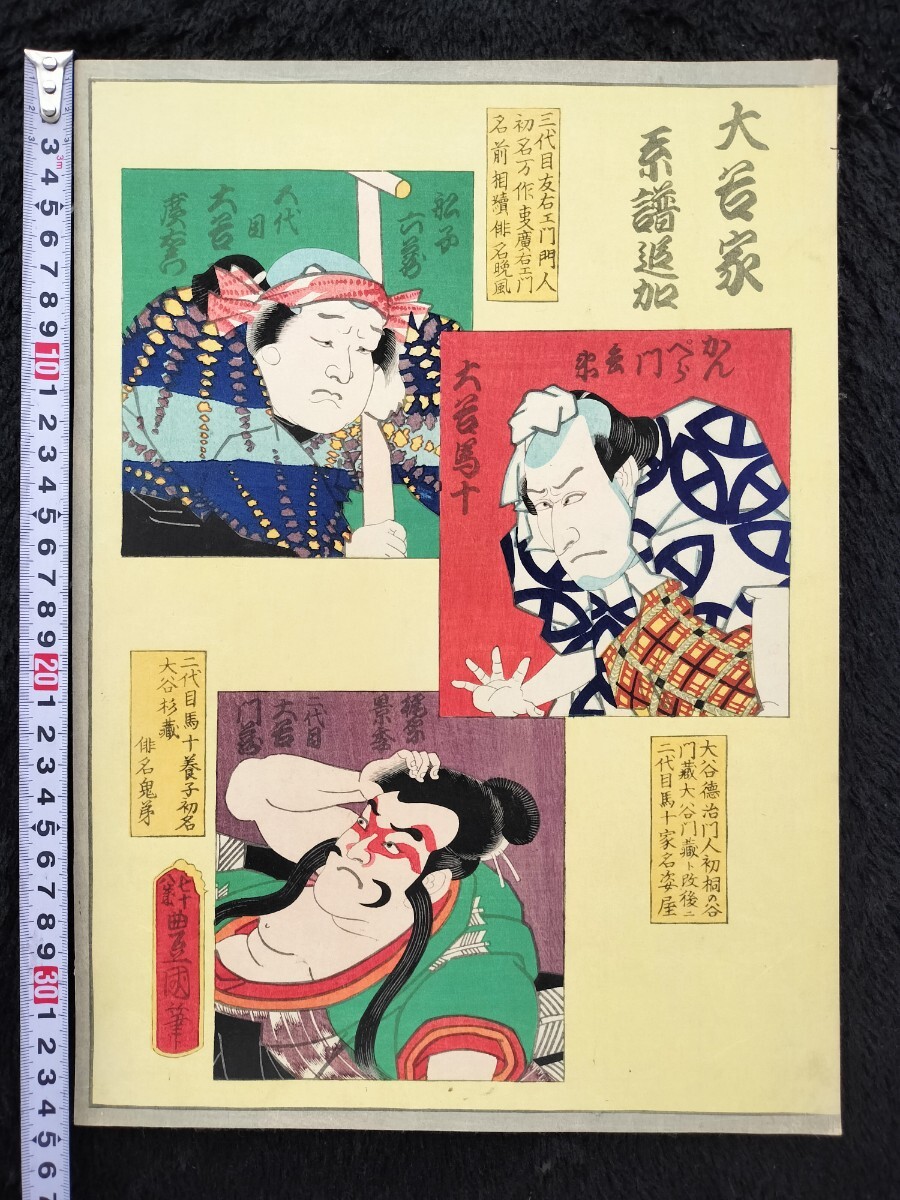 - 江戸期/真作 歌川豊国「大谷家系譜追加」本物浮世絵木版画 役者絵 歌舞伎絵 芝居絵 錦絵 大判 裏打ち 保存良い