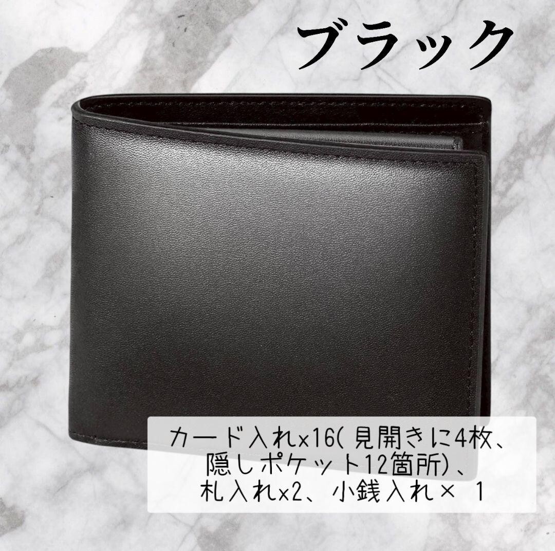 - 二つ折り財布 ブラック 小銭入れ カード16枚収納 スキミング防止機能 磁気防止機能 高級感 上品 収納抜群 ビジネス カジュアル