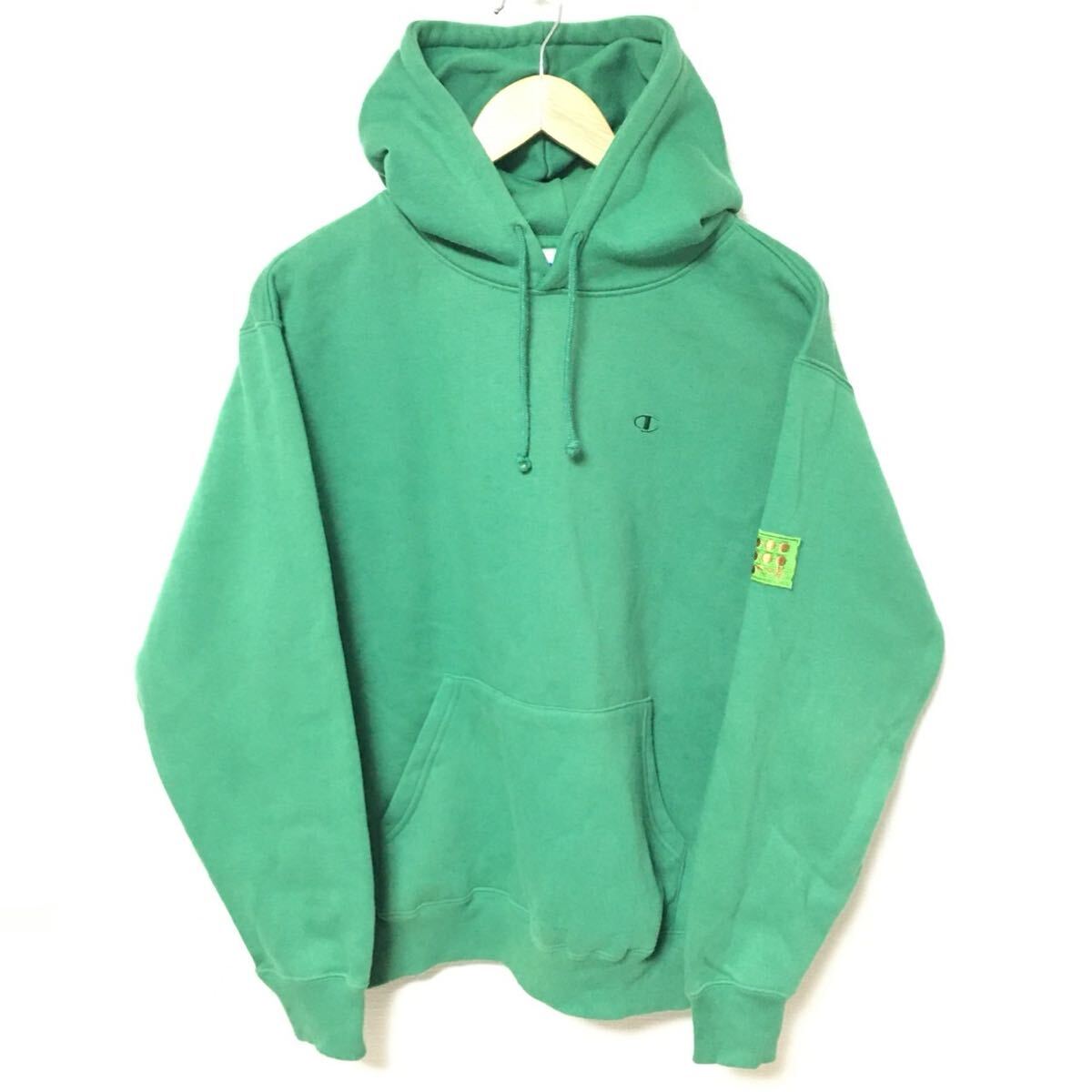 > W207【Champion】チャンピオン フーディ パーカー 十六茶 ワッペン 非売品 希少 裏毛 カジュアル スポーティ グリーン メンズ サイズL位/fF