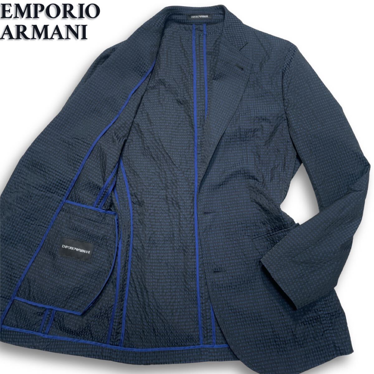 - 極美品/入手困難◎ エンポリオアルマーニ EMPORIO ARMANI テーラードジャケット 黒タグ パイピング シアサッカー ダークネイビー×ブルー