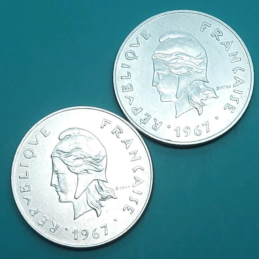 > フランス領ニューカレドニア 50フランニッケル貨 おまとめ2点 1967年 カナックの伝統的な家屋.ヤシの木、ナンヨウスギ 海外コイン 【L313】