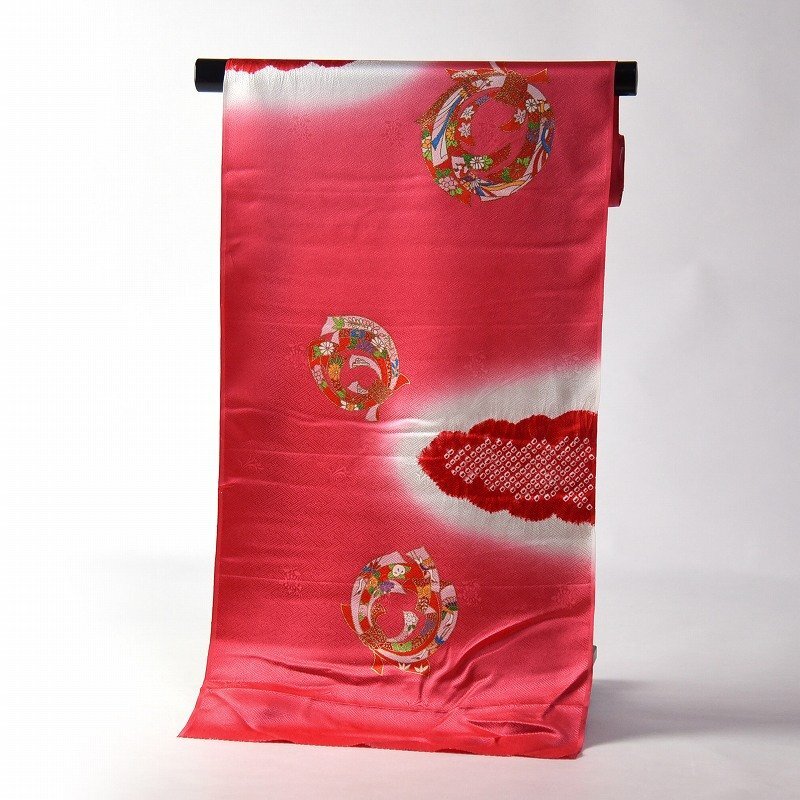 - 【ほりだし堂】 女の子着物 四つ身 束ね熨斗 疋田絞り入り 薄めの赤色 正絹 未仕立 7歳着物 七五三