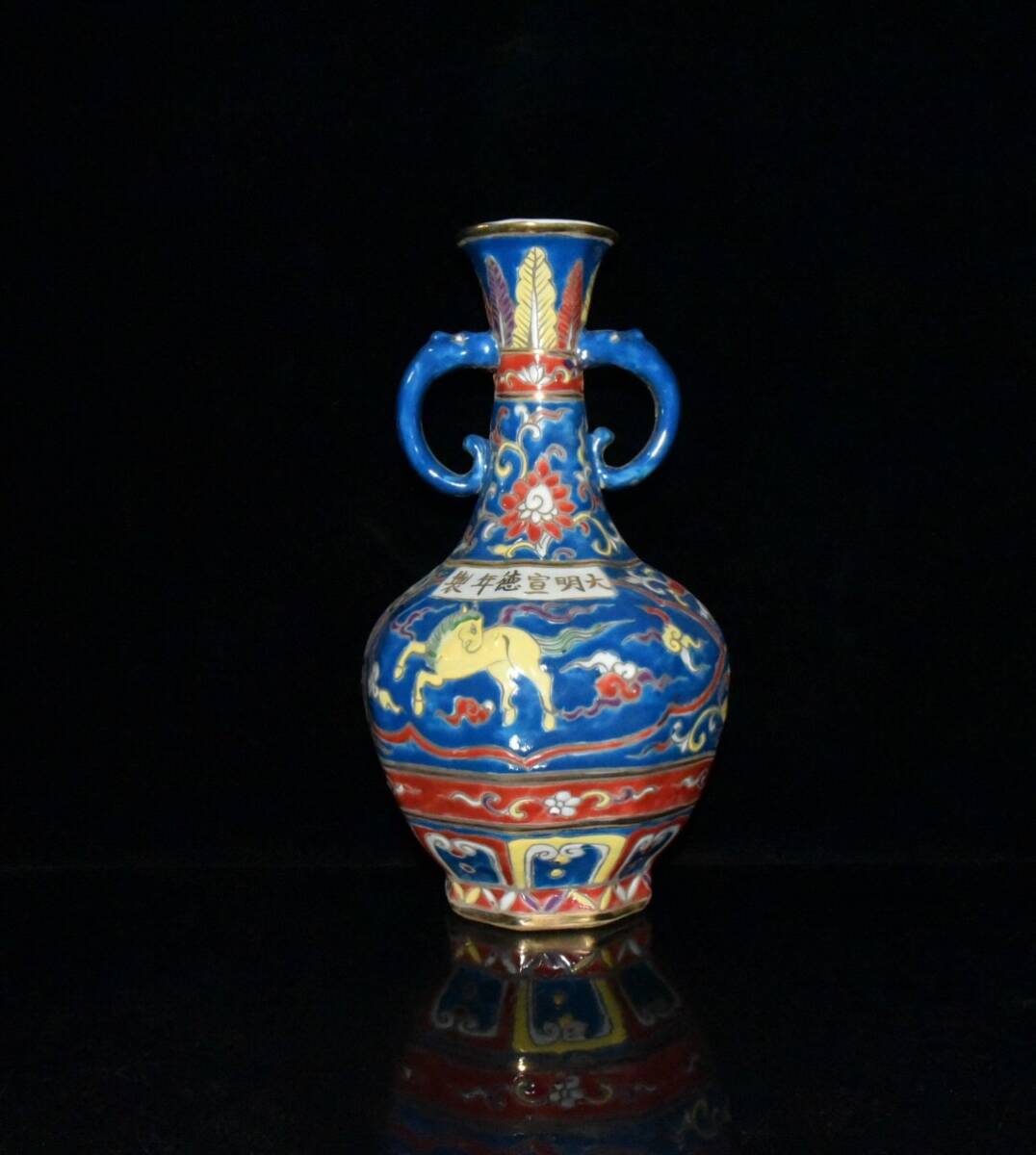 > 蔵友旧蔵出 明 宣德年製款 五彩 描金 獣紋 雙耳瓶 稀少珍品 貴重品 古陶瓷品 置物 古賞物 中国古玩 中国古美術品
