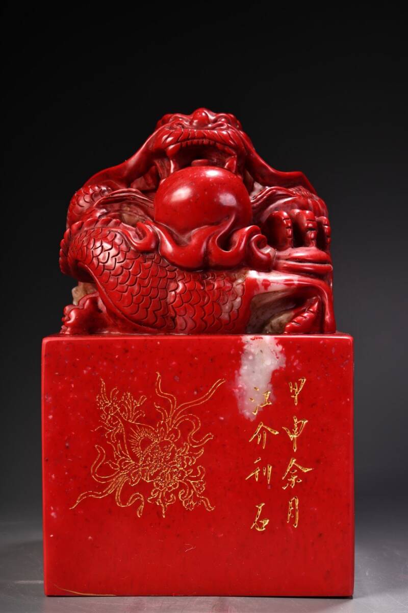 > 永し 清時代 大紅袍 鷄血石彫 盤龍戲珠鈕彫 印章 極細工 置物擺件 古美術品 時代物 古董品 収集 古美味 旧家蔵出 中国唐物 A2