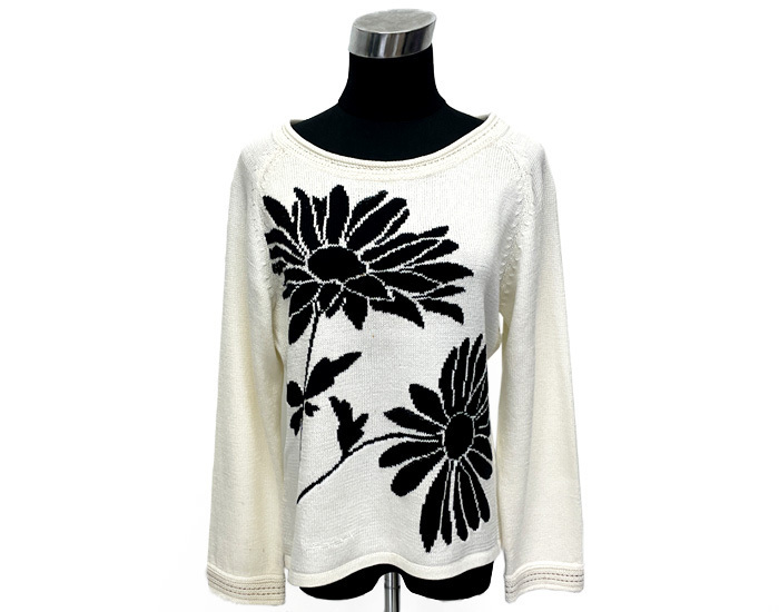 > LEONARD レオナール レディース ニット セーター トップス 綿50% 絹45% アクリル5% ビーズ装飾 オフホワイト 白黒 花柄 春 秋