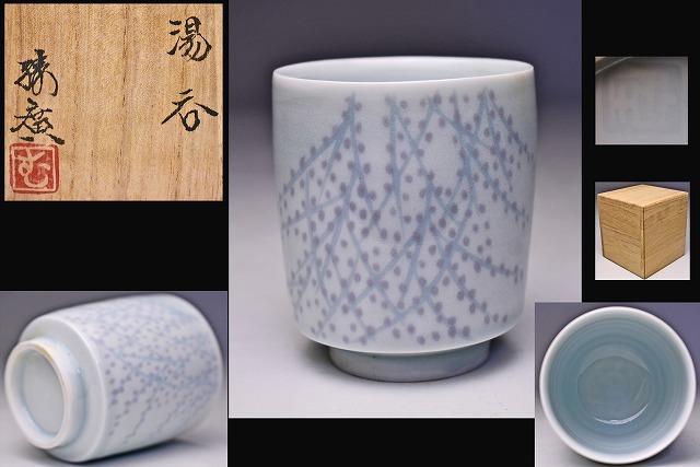 > 室町勝廣 ★ 青白磁 辰砂 湯呑 ★ 共箱 ★ 縁: 宮之原謙 ★ 景色美しい逸品 ★ 食器 ★ 室町勝広