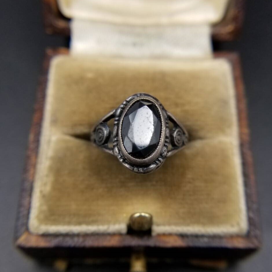 - ヘマタイト オーバル ファセット 925 シルバー ヴィンテージ リング 銀 指輪 レトロ 渦巻 バンド 小さめサイズ Y24-M