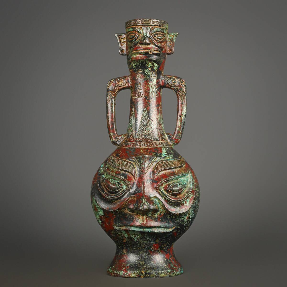 - 蔵友旧蔵出 漢代 青銅作 精工 人面扁瓶 希少珍品 貴重品 置物 古賞物 中国古玩 中国古美術品 館蔵品
