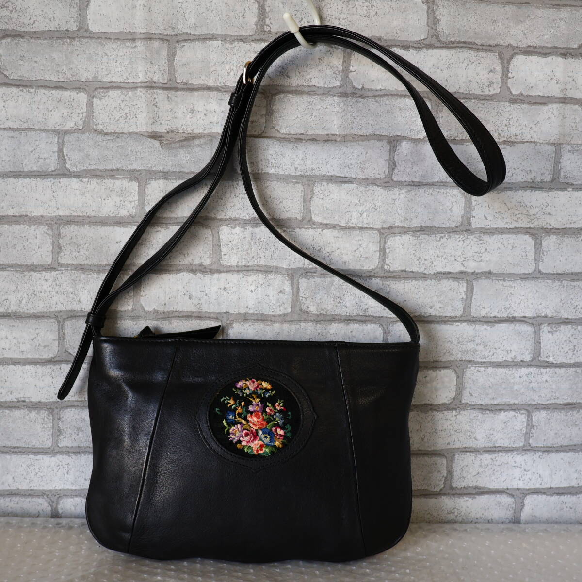 - *美品*Petit Point/MichikoKuge/久家道子*花柄*プチポワン*レザー*ショルダーバッグ*黒*