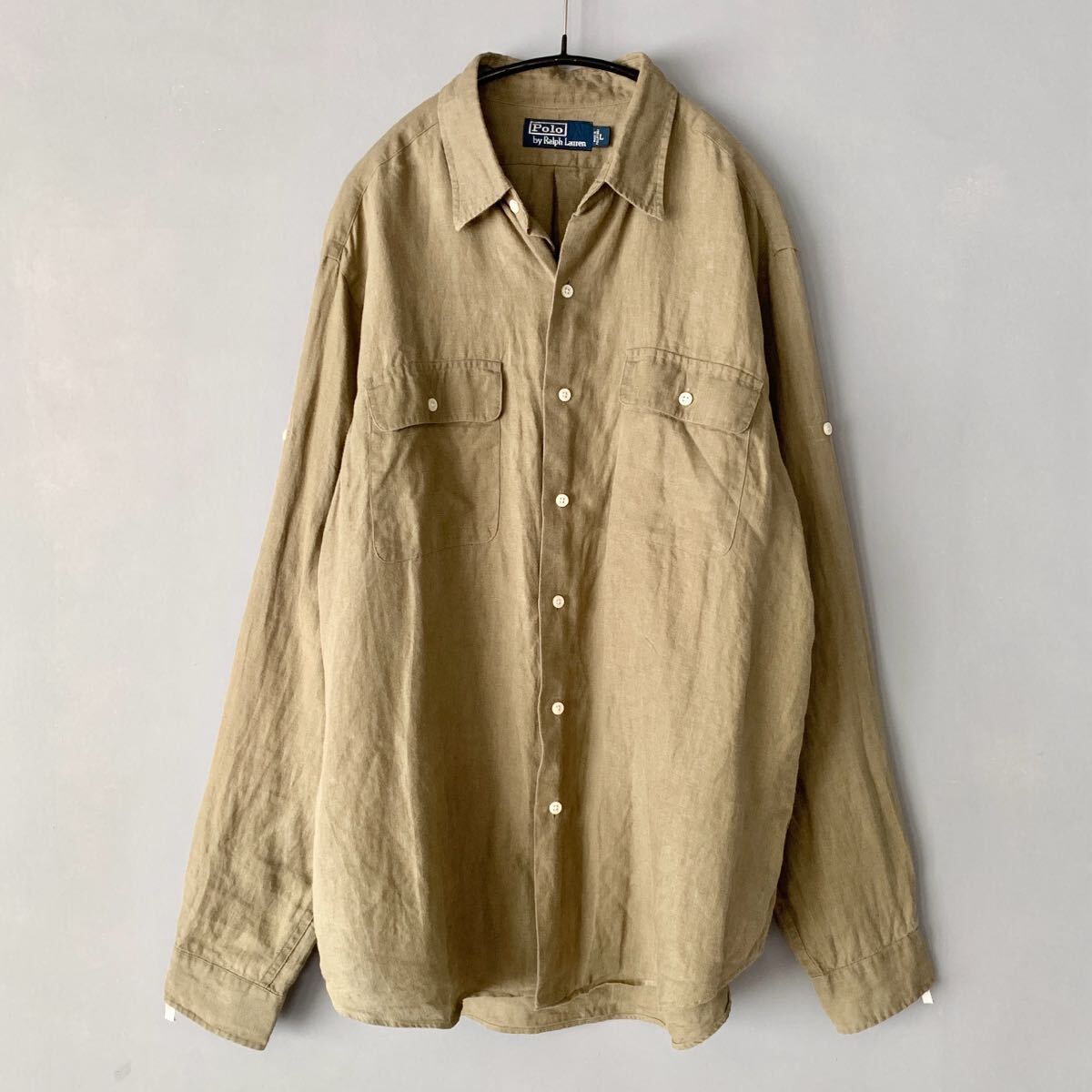 - ポロ ラルフローレン 90's リネン ワークシャツ L カーキ USA polo by talph lauren