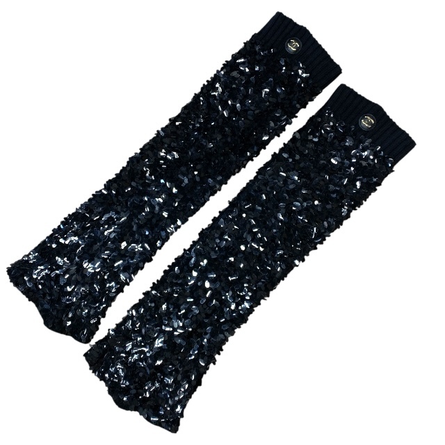 - 美品 シャネル レッグウォーマー ゲートル ココマーク ダブルCマーク ロゴ スパンコール コットン ブラック ゴールド レディース CHANEL