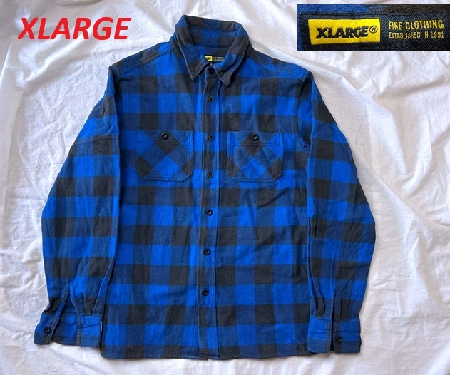- XLARGEエクストララージチェックネルシャツM青黒★長袖ブロックチェック