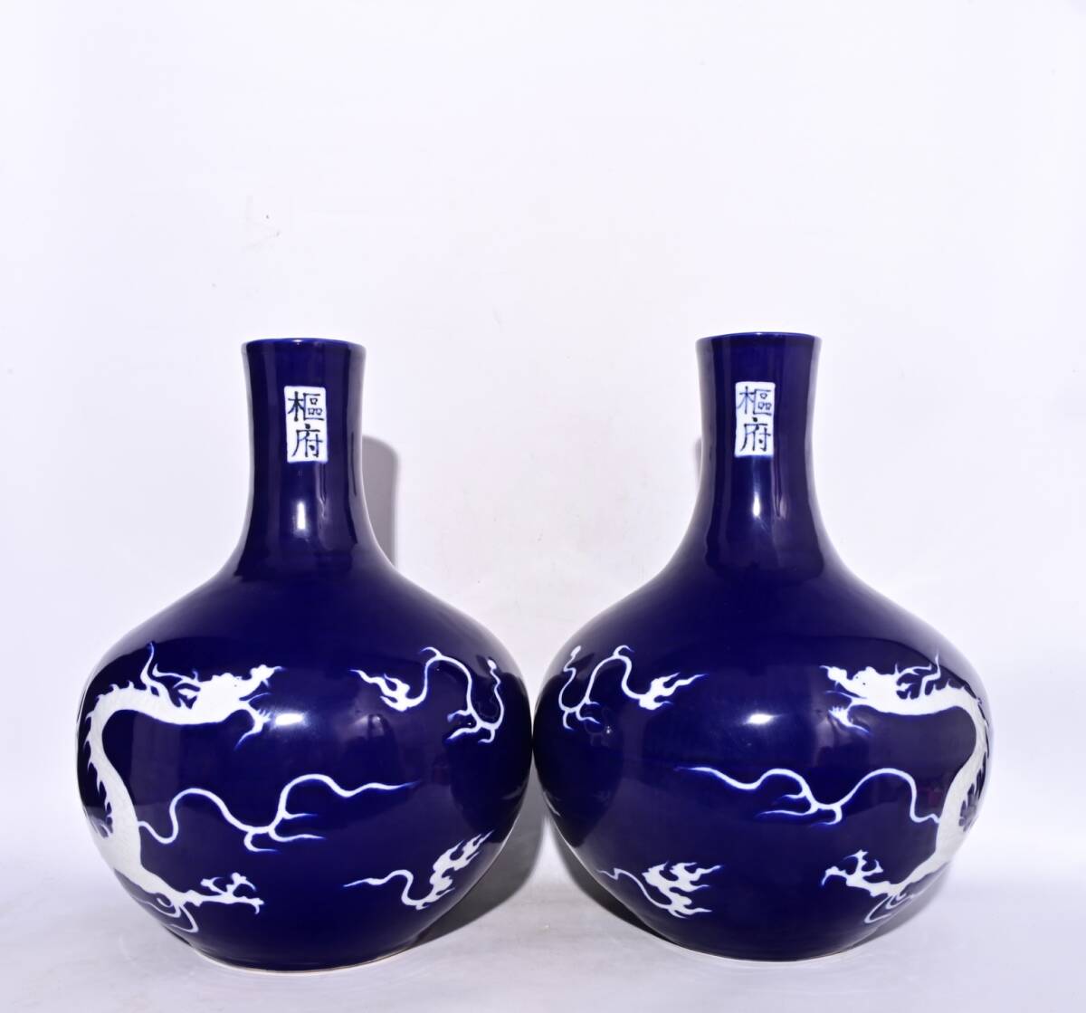 > 9+GV9206「東洋美術」 中国骨董 人間国宝 磁器製品【元宋府印青釉龍文白地供儀花瓶】 旧物 孤品 珍品 陶磁器 収蔵価値が高い