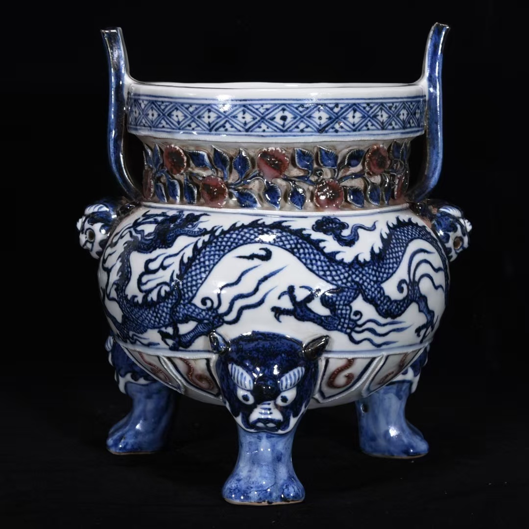 - 磁器 元時代 青花釉里紅捏花龍紋香炉・鼎 秘蔵 26cm古陶磁器 陶芸 唐物 古賞物 時代物 骨董品 古置物 極細工 中国磁器 古美味 中国古玩921
