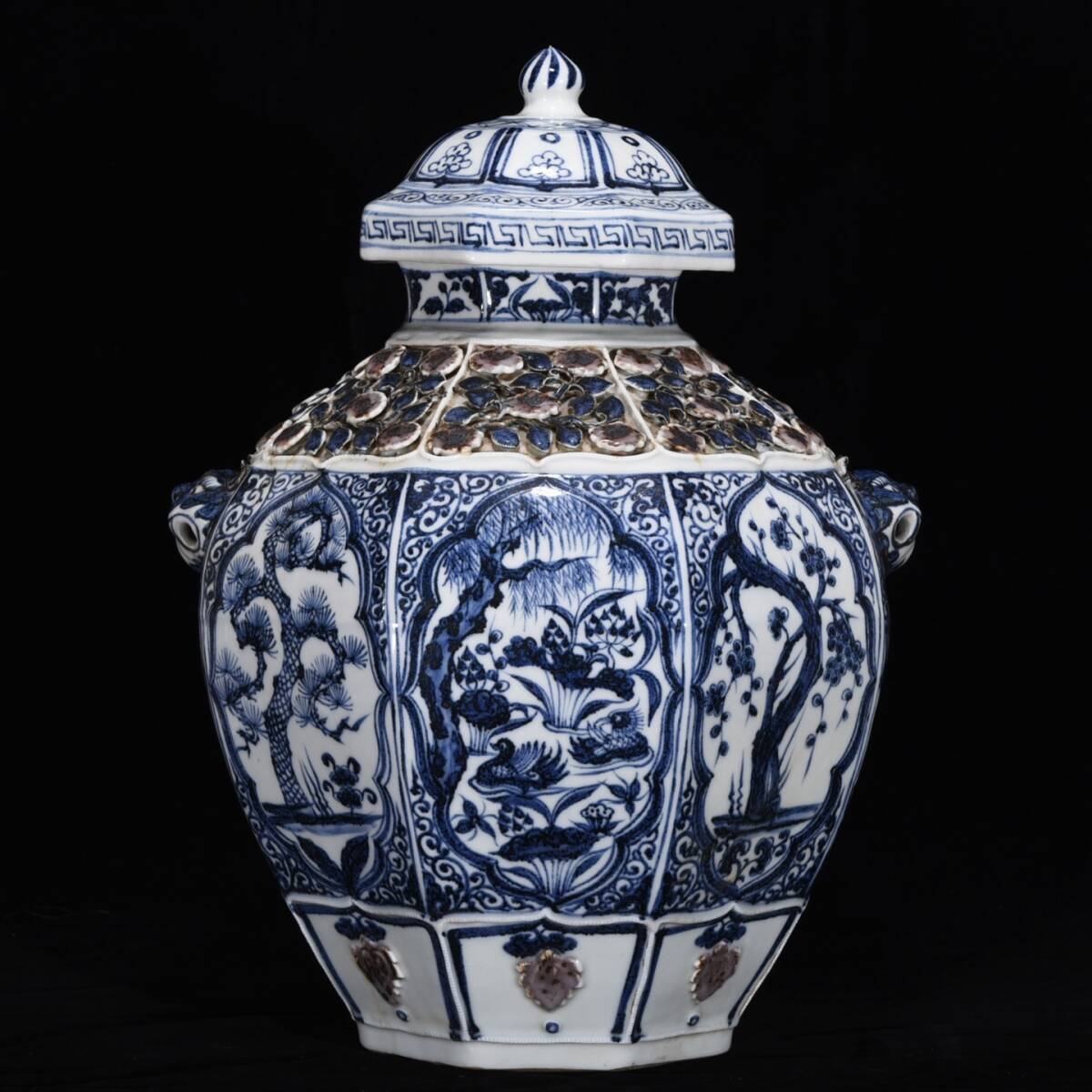 - 磁器 元時代 青花釉里紅捏花松竹梅鴛鴦戲水紋八方虎頭蓋罐・缸 秘蔵 44.5cm古陶磁器 陶芸 唐物 古賞物 時代物 骨董品 古置物 中国磁器 古玩