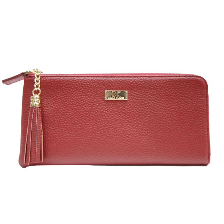 牛革シュリンク素材を使用した上品な印象の長財布です。 フロント部分にはブランドロゴが入ったゴールドのプレートが 付いており、アクセントになっています。 ファスナー引手にはタッセル飾りがついており、取り外しも 可能でお好みで付けられます。