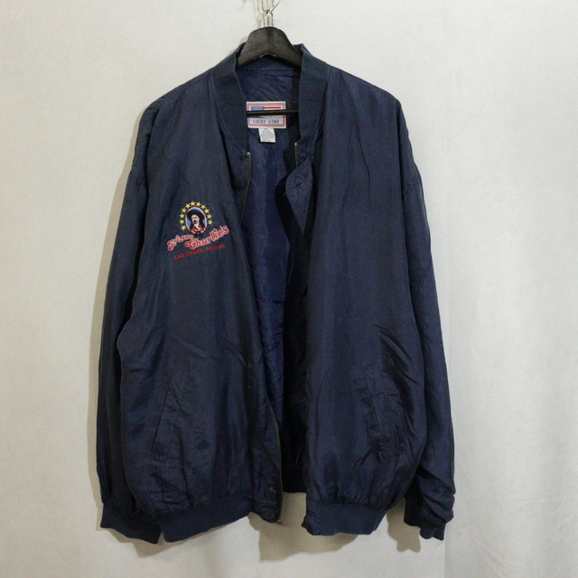 - H933 80sビンテージ LUCKYSTAR ブルゾンジャケット■1980年代製 表記2XLサイズ ネイビー シルク 刺繍 ラスベガス アメカジ ストリート