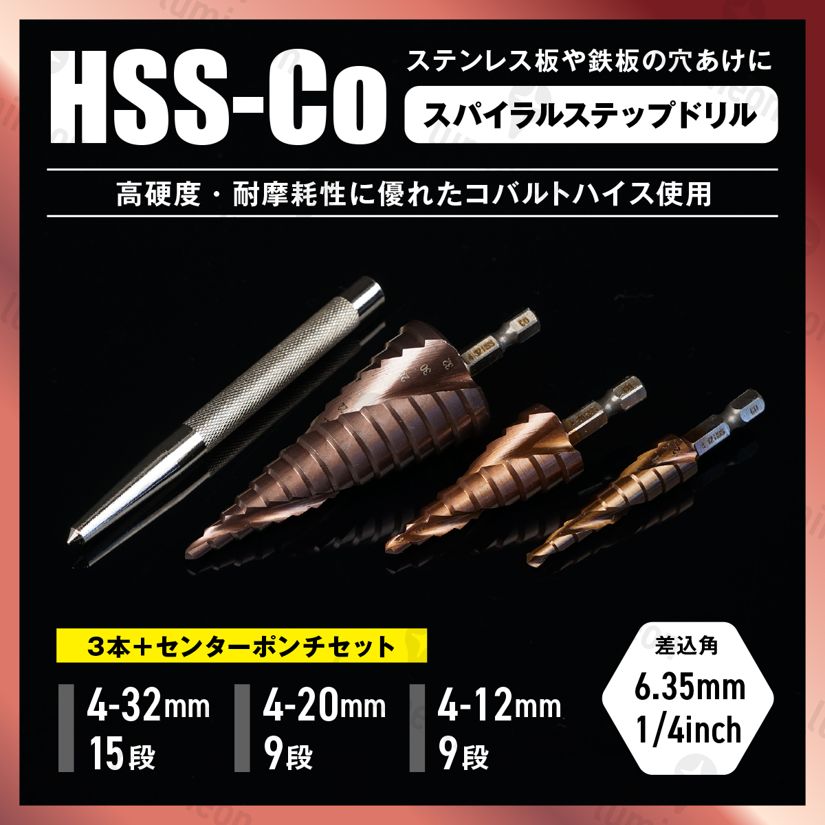 > 高強度 スパイラル ステップ ドリル タケノコ ビット 4-12 20 32mm 3本 セット ステンレス 用 鉄鋼 穴あけ 鉄工 HSS鋼 六角 工具 g190e 3