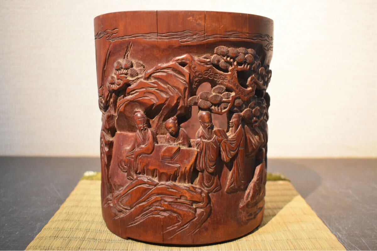- 【GE】E436【コレクター所蔵品】時代 木彫筆筒/中国古玩 中国美術 書道具 文房具 彫刻 骨董品 時代品 美術品 古美術品
