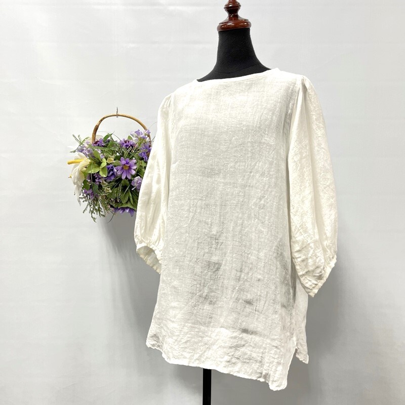 - はりしごとfuku/リネンオーバーサイズチュニック/麻100%/ギャザースリーブ/ラウンドヘム/ハーフスリーブ/ゆったりシルエット