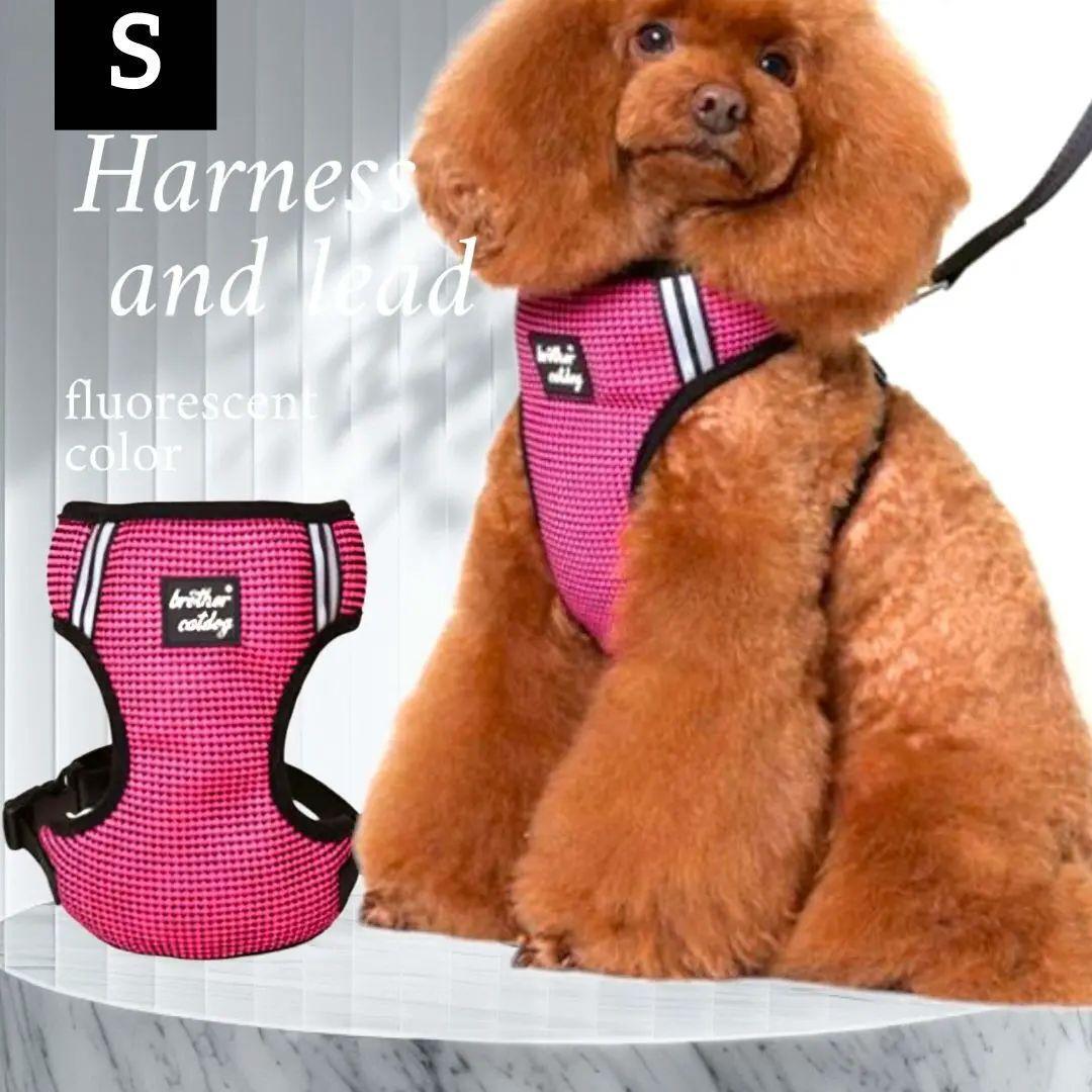 - 【新品】【S】犬用 ハーネスリードセット 蛍光ピンク 軽量 クッション素材 蛍光色 チワワ プードル 行楽 散歩 旅行 お洒落 胴輪 リード
