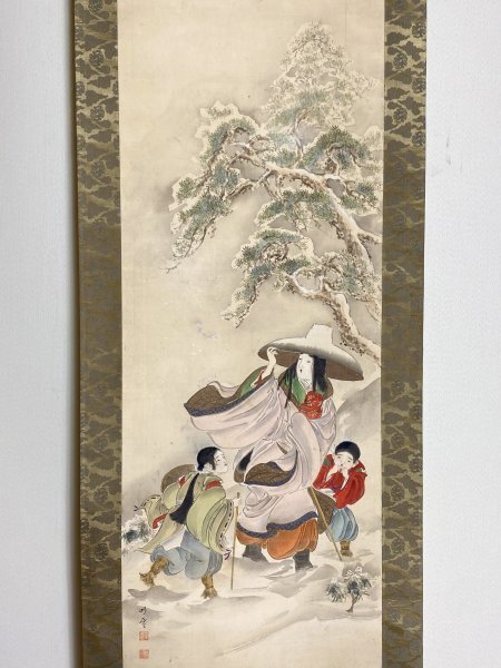 - 《魚亀》【模写】明雪「常磐雪行」絹本 合箱 美人画 日本画 茶掛 茶道具 古美術 掛軸 掛け軸 中国 人が書いたもの