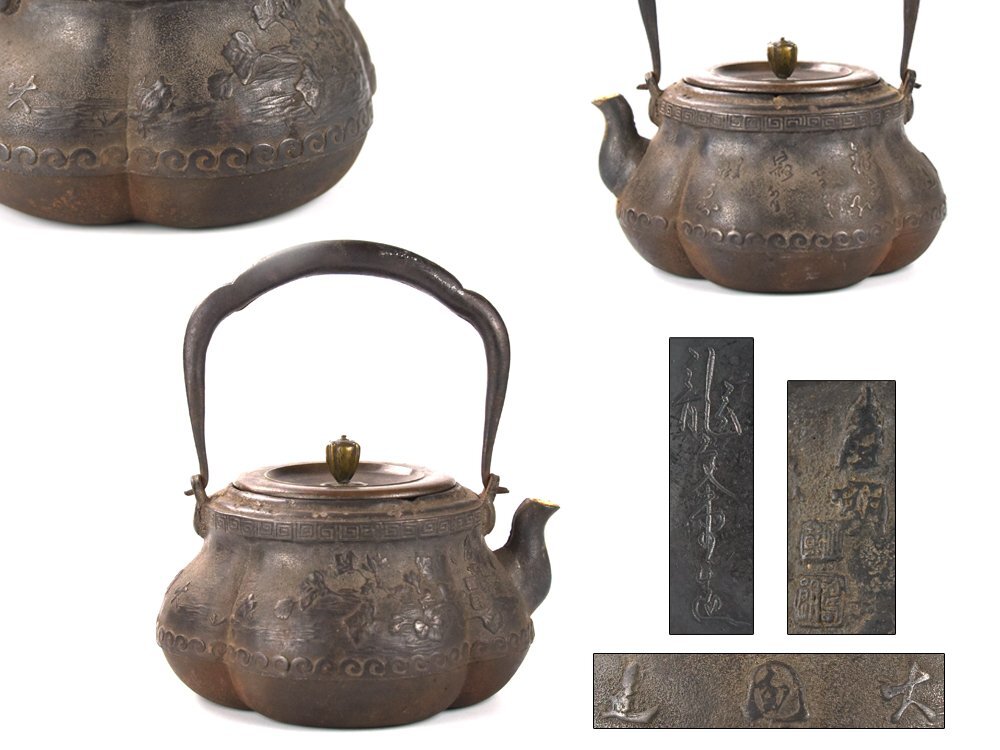 > 【北】龍文堂 大國 寿朗 造 阿古陀形 蓮に蛙和歌 陽刻 提手銀象嵌 鉄瓶 高さ19.3㎝ 容量870ml / 煎茶 茶道具 湯沸