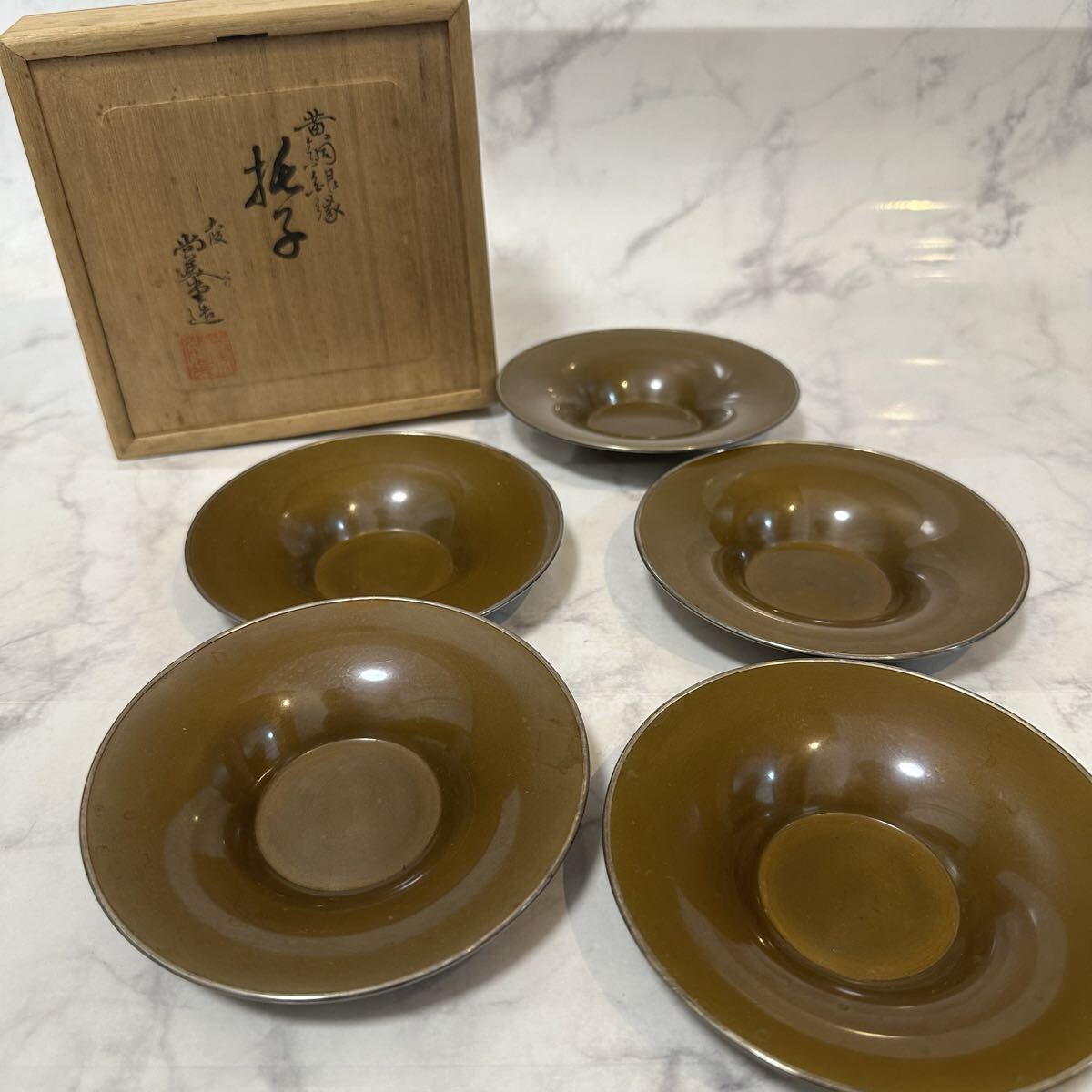 - 希少 大阪尚美堂造 黄銅銀縁 冨士形 扞子五客 共箱 茶托 5枚セット 金属工芸 茶道具 茶器 煎茶道具 茶托 在銘 五客 骨董