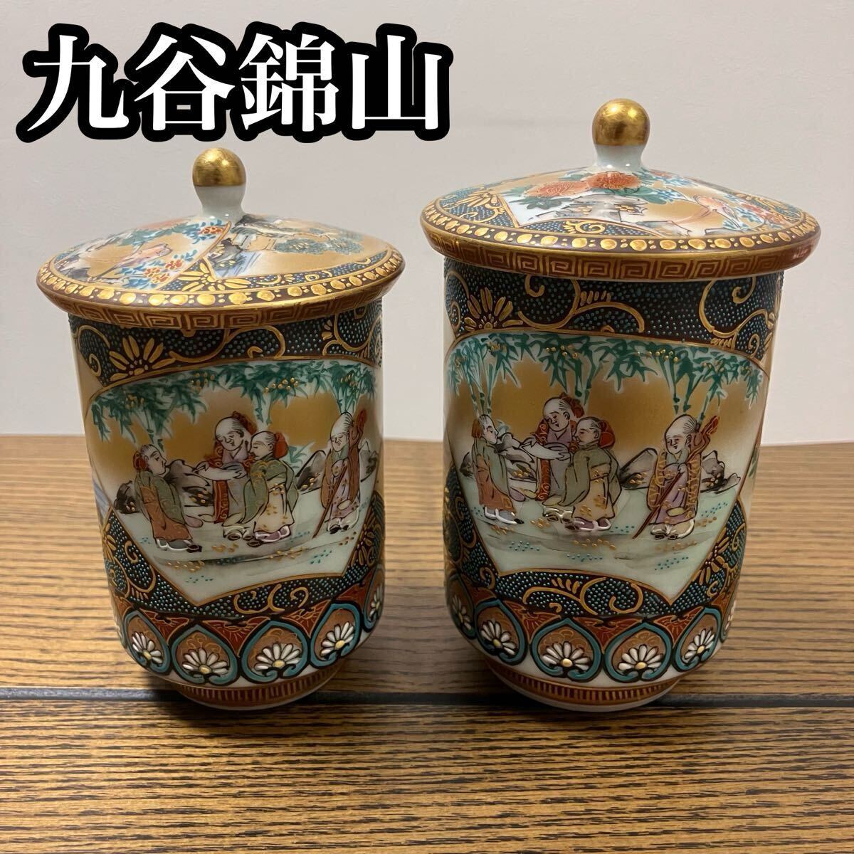 - 九谷焼 錦山 夫婦湯呑 金彩 茶造歌 蓋付 内細字 青粒賢人図