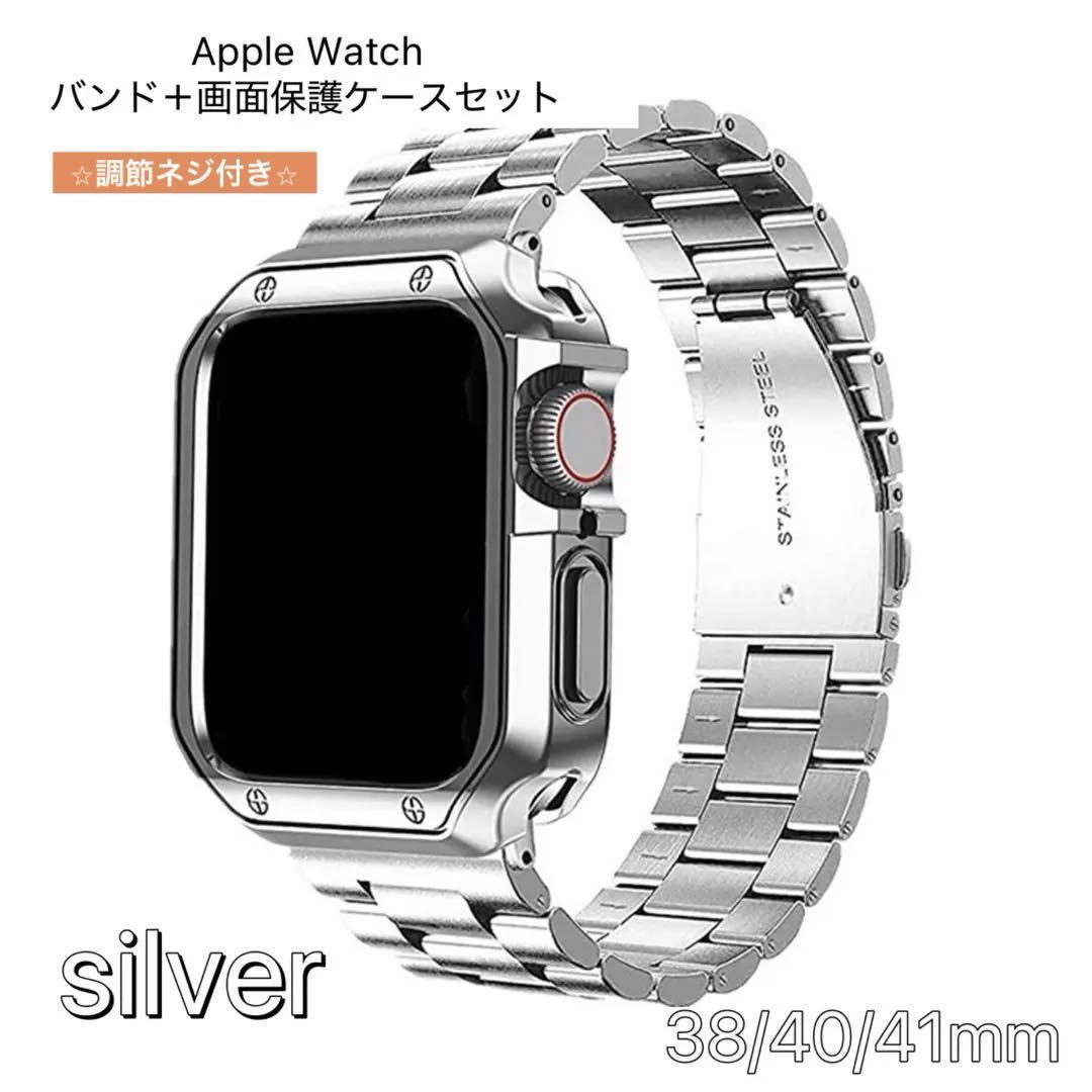 > Apple Watch バンド ケース セット 38/40/41mm ステンレス シルバー コマ調節器付き 高級感 人気