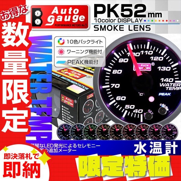 > 【限定セール】オートゲージ 水温計 52mm ワーニング ピーク機能 スイス製モーター 10色 スモークレンズ 追加メーター 計器 黒 PK10C