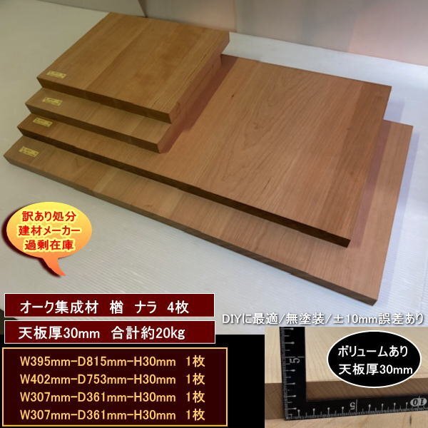 - オーク 楢 ナラ 集成材 端材4点セット 約20kg 無塗装 高級材 395-815-30mm 他3 送料無料 訳あり処分 重量あり DIYにお勧め!