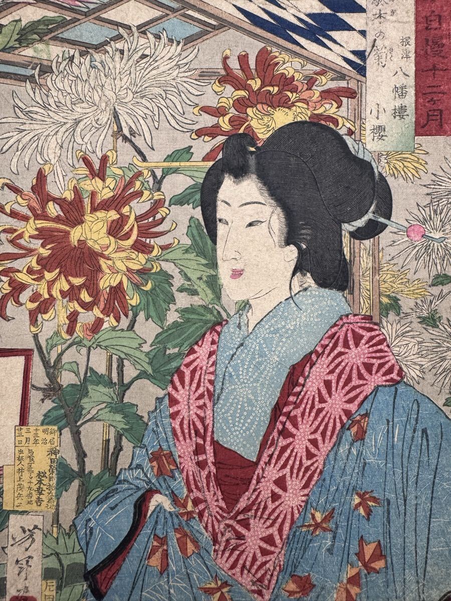 - 【真作】名作!本物浮世絵木版画 月岡芳年【東京自慢十二ヶ月 九月 千駄木の菊 根津八幡樓 小櫻】明治期 美人図 大判 錦絵 保存良い 裏打ち